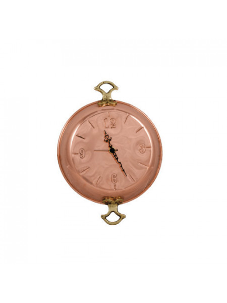 Ceas de perete din cupru model tigaie cu 2 manere, fabricat manual in Grecia, cu mecanism Quartz made in Germany, ideal pentru bucatarie, cafenea, pub sau cabana.