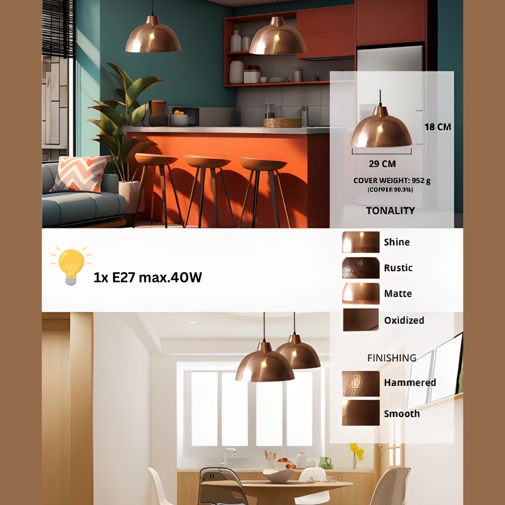 In locuinta ta, CS05CO se potriveste perfect deasupra mesei din dining, intr-un living, sau intr-un open space unde vrei o lumina care sa faca atmosfera. Cuprul reflecta lumina intr-un mod cald si placut, iar finisajul lovitura de ciocan adauga profunzime si caracter. Camera pare mai “asezata”, mai coerenta, iar lustra devine acel detaliu care leaga totul: mobilier, culori, texturi.