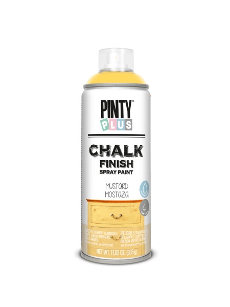 - Spray cu vopsea pe baza de apa, Pinty Plus Chalk Paint da un aspect antichizat, de invechit, oricarui suport pe care il aplicati fie el din lemn, carton, metal, plastic, sticla, melamina, panza de pictat si chiar polistiren (polistirenul nu este afectat, nu se deformeaza sub actiunea acestei vopsele). Culori pastelate, aspect final mat, catifelat la atingere. Culoare: CK801 YELLOW MUSTARD.
