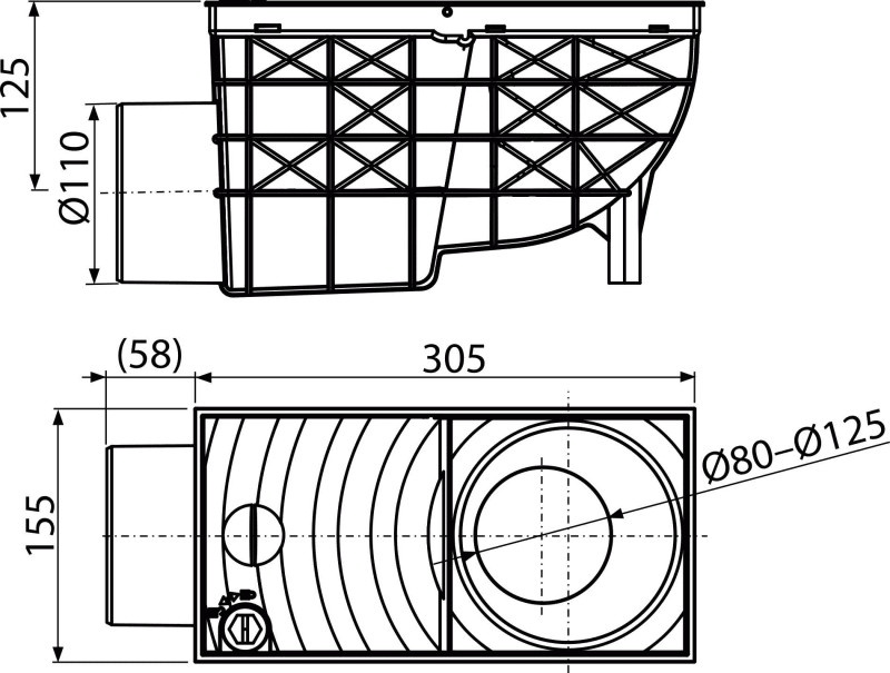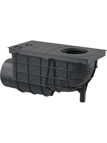 - Racord de burlan 300×155/110 mm cu clapetă şi coş de colectare cu ieşire laterală AGV3 alcadrain, negru