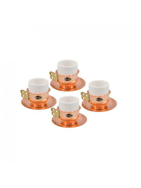 Setul include: 4 x cești din cupru + cupe de porțelan de 50 ml + farfuriuțe din cupru.