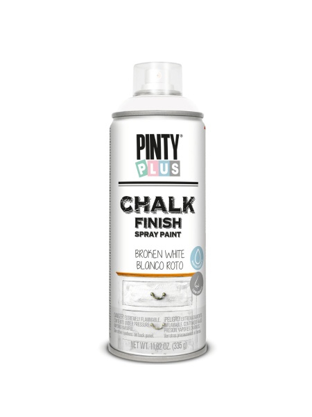 - Spray cu vopsea pe baza de apa, Pinty Plus Chalk Paint da un aspect antichizat, de invechit, oricarui suport pe care il aplicati fie el din lemn, carton, metal, plastic, sticla, melamina, panza de pictat si chiar polistiren (polistirenul nu este afectat, nu se deformeaza sub actiunea acestei vopsele). Culori pastelate, aspect final mat, catifelat la atingere. Culoare: CK788 BROKEN WHITE.